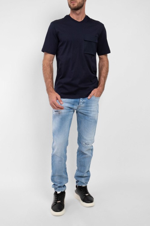 Мужские голубые джинсы из хлопкового микса от PMDS (ПиЭмДиЭс). Классическая длина, застежка на пуговицы, пяти-карманная модель, петли в поясе для ремня, патч-лого, дизайн с потертостями, рванные детали.