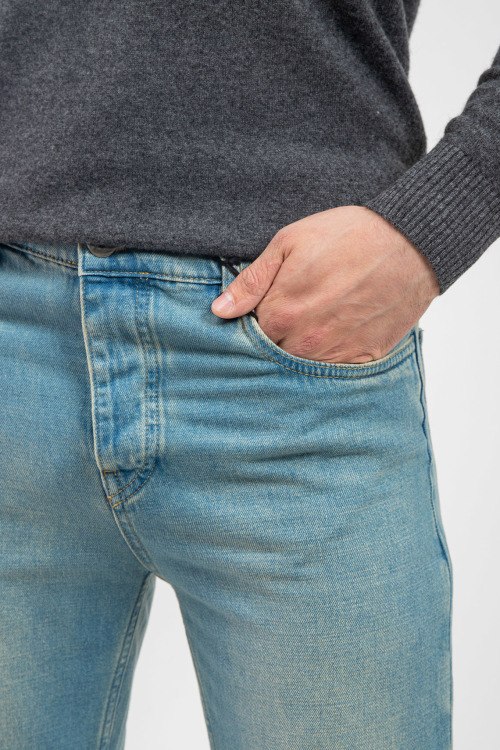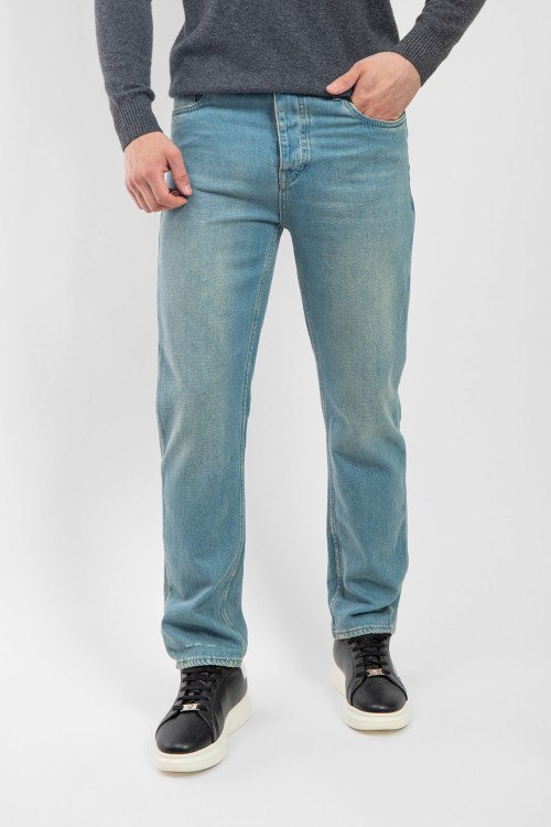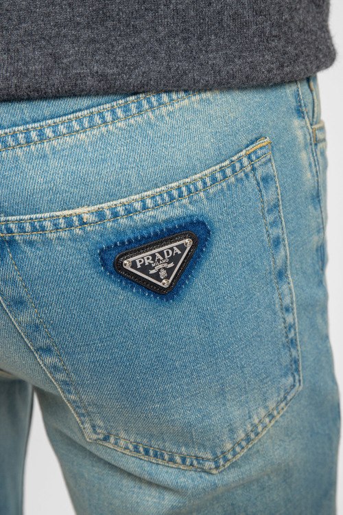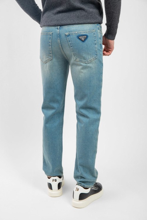 Мужские голубые джинсы Straight из хлопка от Prada (Прада). Классическая длина, застежка на молнию и пуговицу, пять карманов, петли в поясе для ремня, патч-лого.