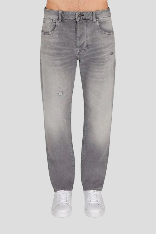 Детали: Мужские серые прямые джинсы от Armani Exchange (Армани Эксчендж). Пяти-карманная модель, дизайн с потертостями, в поясе с петлями для ремня, нашивка с логотипом сзади на поясе, полная длина