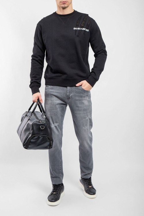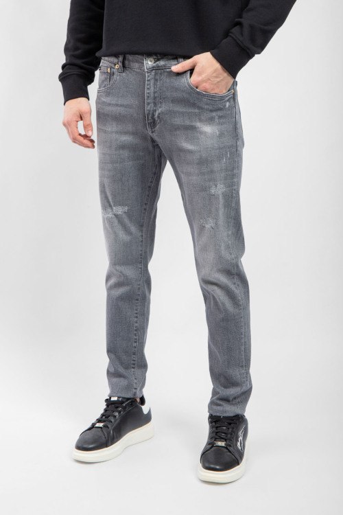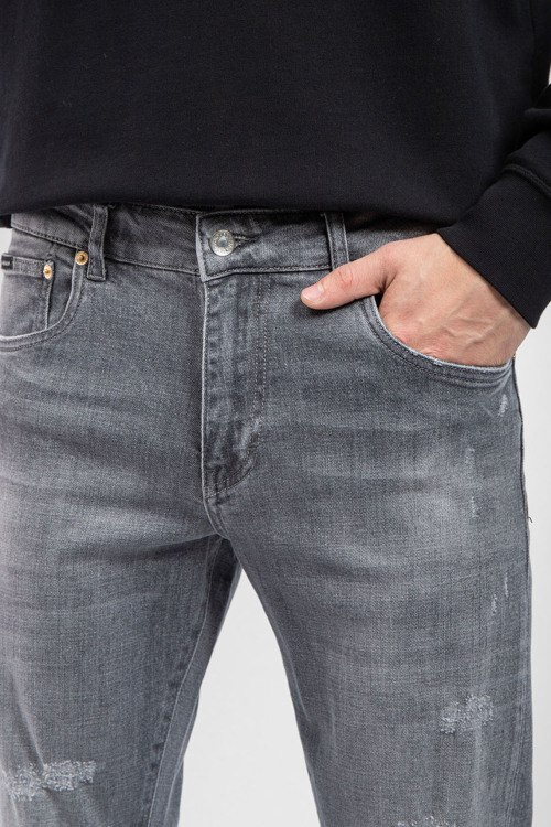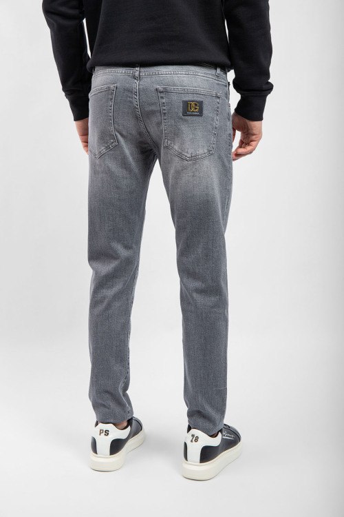 Детали: Мужские серые джинсы от Dolce & Gabbana (Дольче энд Габбана). Пяти-карманная модель, дизайн с потертостями, пояс с петлями для ремня, нашивка с логотипом на заднем кармане, полная длина
