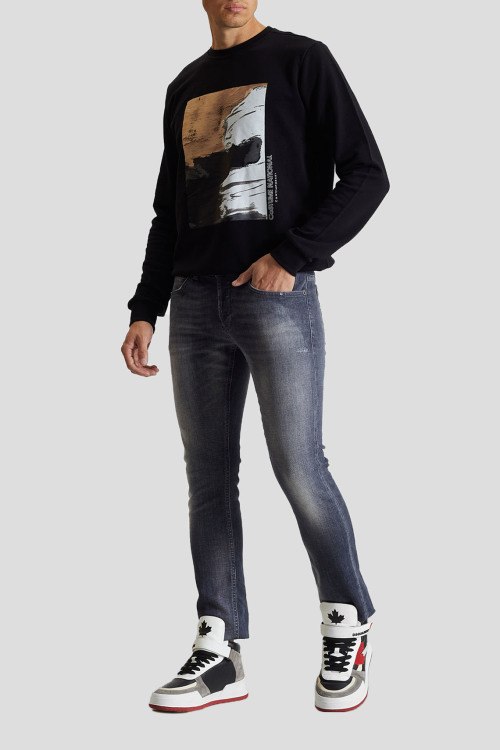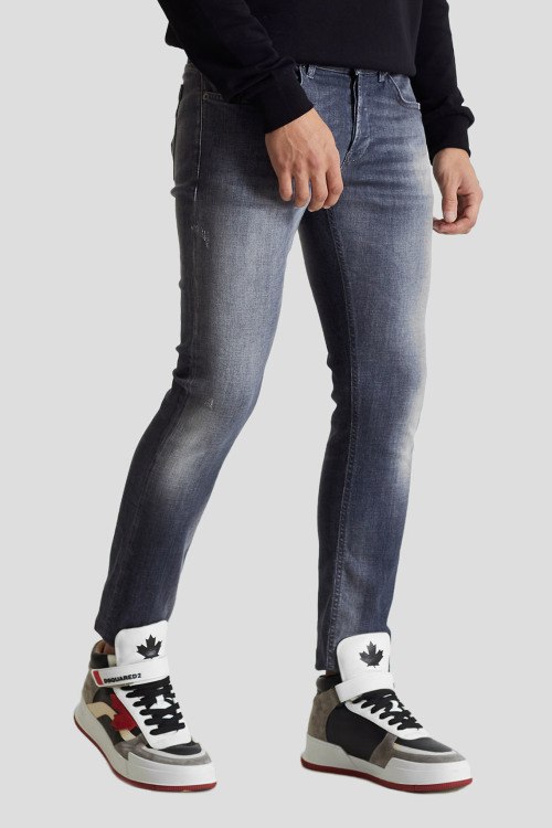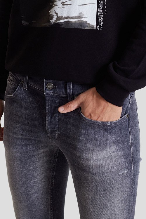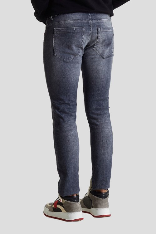 Детали: Мужские серые узкие джинсы от Dondup (Дондап). Пяти-карманная модель, дизайн с потертостями, пояс с петлями для ремня, узкий крой, полная длина