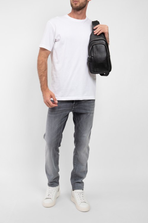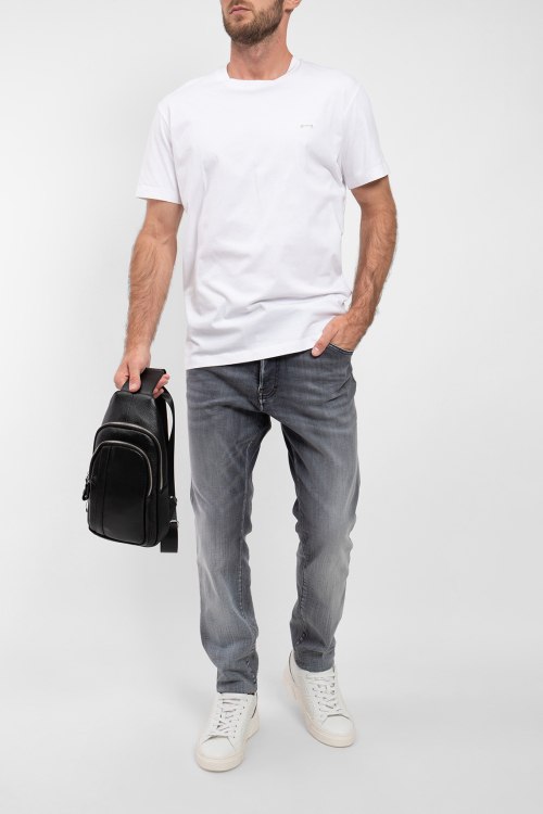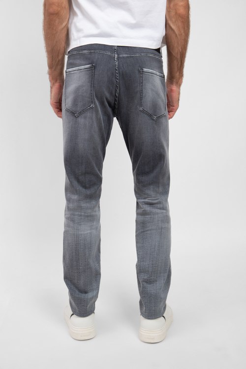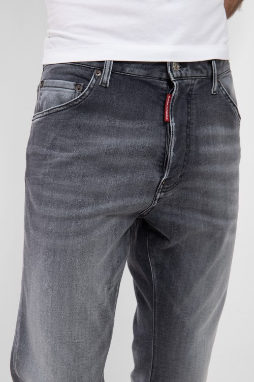 Мужские серые джинсы из хлопкового микса от Dsquared2 (Дискваред). Классическая длина, застежка на пуговицы, пяти-карманная модель, петли в поясе для ремня, дизайн с потертостями, патч-лого.