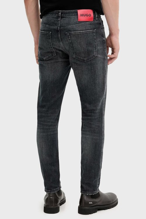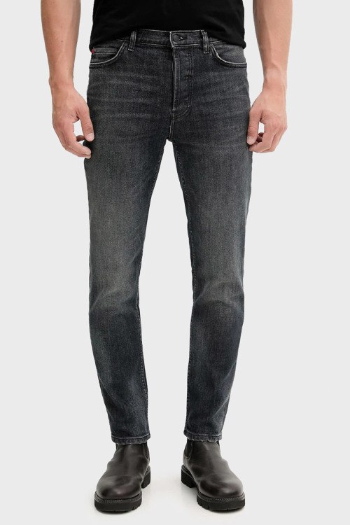 Детали: Мужские серые зауженные джинсы от Hugo by Hugo Boss (Хуго бай Хуго Босс). Пяти-карманная модель, дизайн с потертостями, пояс с петлями для ремня, нашивка с логотипом сзади на поясе, зауженный крой, полная длина