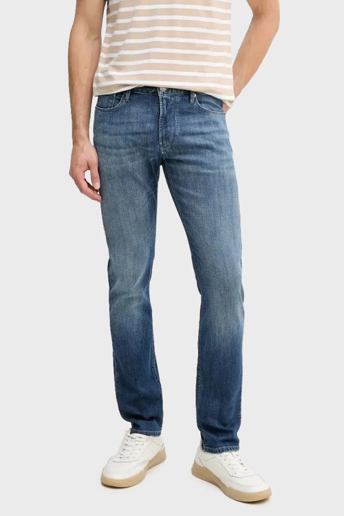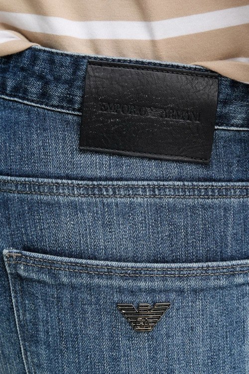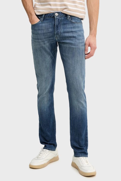 Детали: Мужские синие джинсы от Emporio Armani (Эмпорио Армани). Пяти-карманная модель, пояс с петлями для ремня, нашивка с логотипом сзади на поясе, зауженный фасон, полная длина