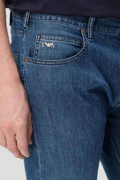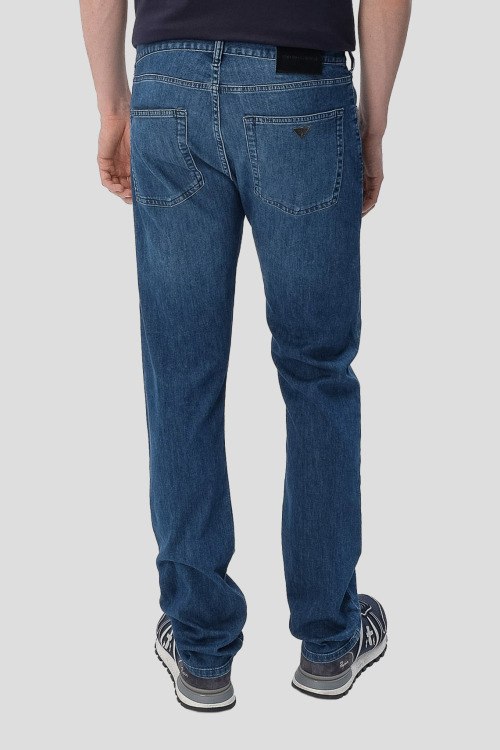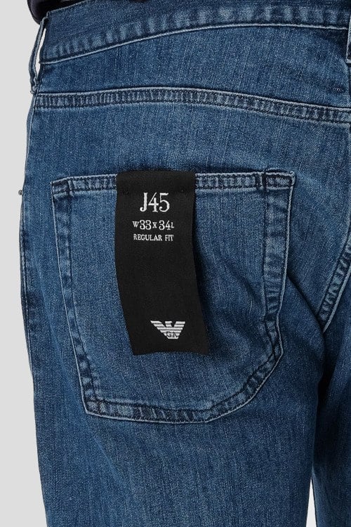 Детали: Мужские синие джинсы J45 от Emporio Armani (Эмпорио Армани). Пяти-карманная модель, пояс с петлями для ремня, нашивка с логотипом сзади на поясе, крой Regular Fit, полная длина