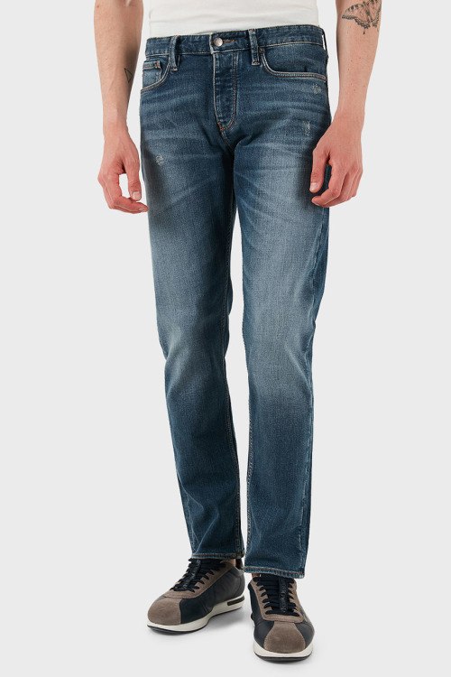 Детали: Мужские синие джинсы от Emporio Armani (Эмпорио Армани). Пяти-карманная модель, дизайн с потертостями, пояс с петлями для ремня, нашивка с логотипом сзади на поясе и на заднем кармане, прямой крой, полная длина