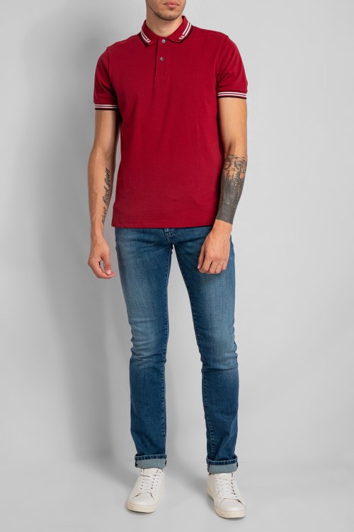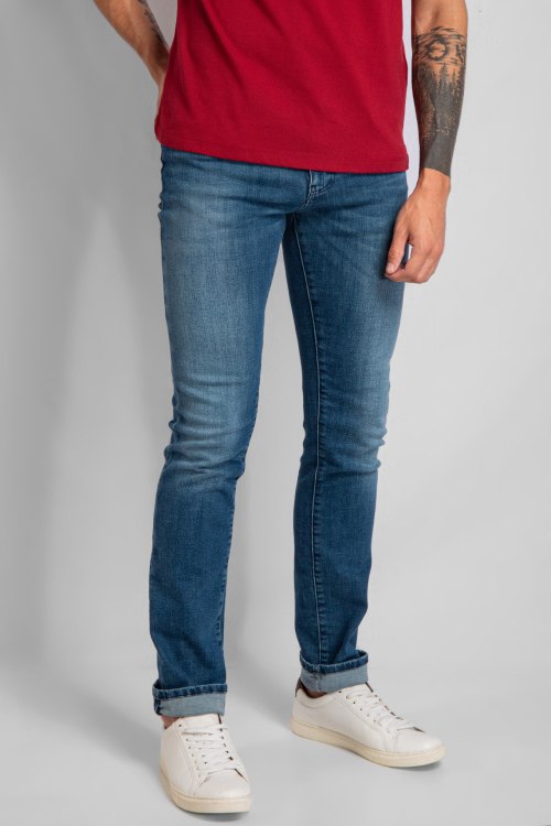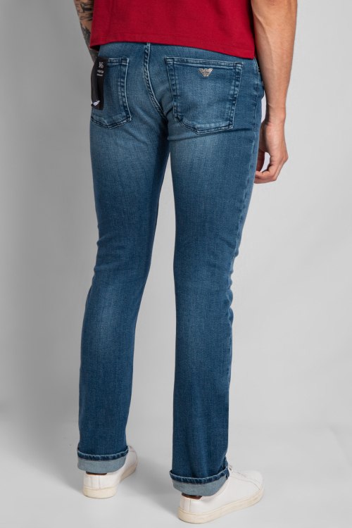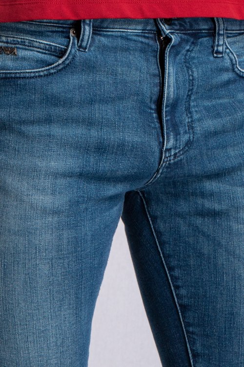 Мужские синие джинсы от Emporio Armani (Эмпорио Армани). Классическая пяти-карманная модель, средняя посадка, застежка на молнию и пуговицу, пояс с петлями для ремня, дизайн с потертостями, патч-лого на заднем кармане.