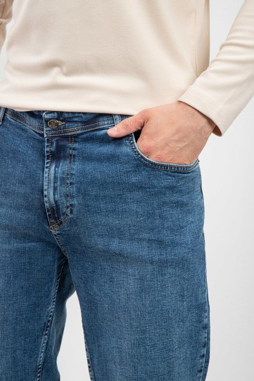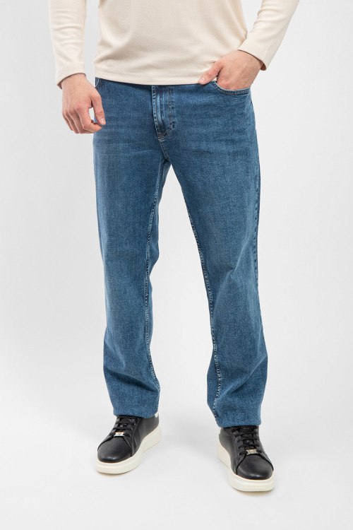 Мужские синие джинсы из хлопка от Armani (Армани). Модель Regular fit, застежка на молнию и пуговицу, петли в поясе для ремня, патч-лого.