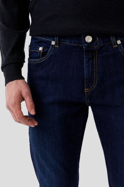 Детали: Мужские темно-синие джинсы slim fit от Billionaire (Биллионер). Средняя посадка, пять карманов, застежка на пуговицу и молнию, шлевки для ремня на поясе, патч логотипа, брендовая вышивка сзади