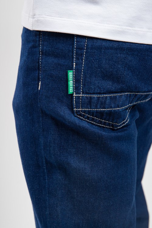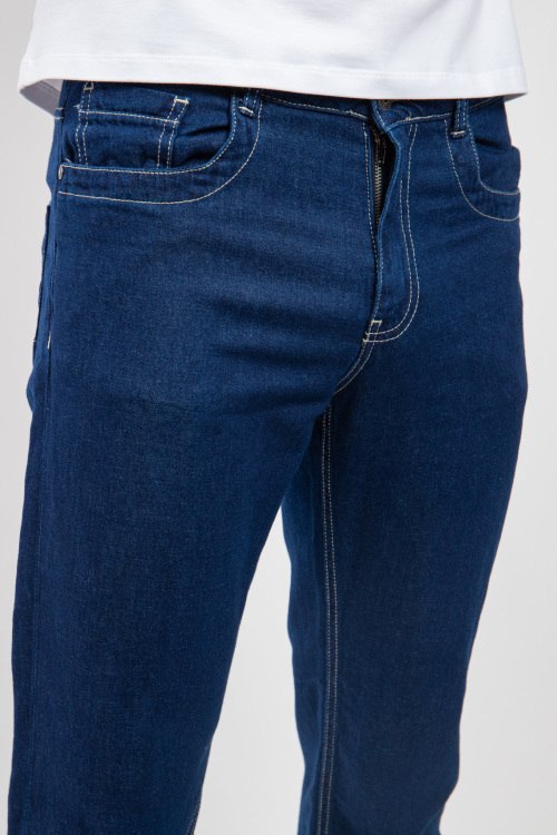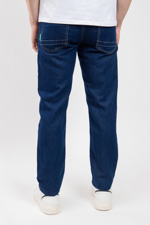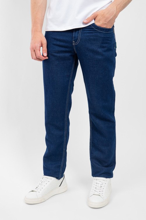 Детали: Мужские синие джинсы из хлопка и льна от Bikkembergs (Биккембергс). Пяти-карманная модель, пояс с петлями для ремня, нашивка с логотипом на заднем кармане, прямой крой, полная длина