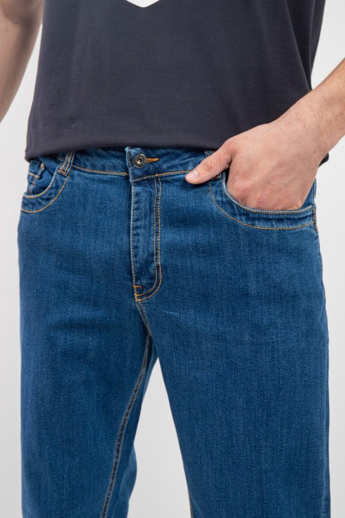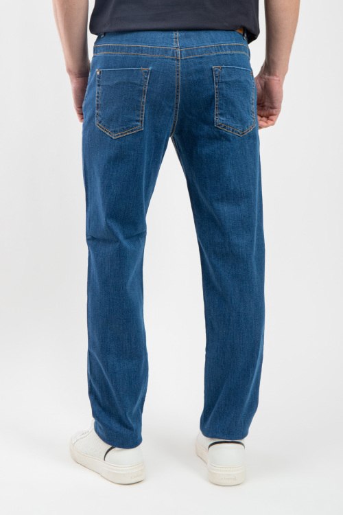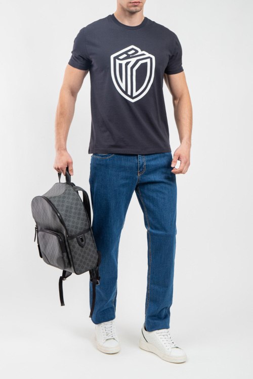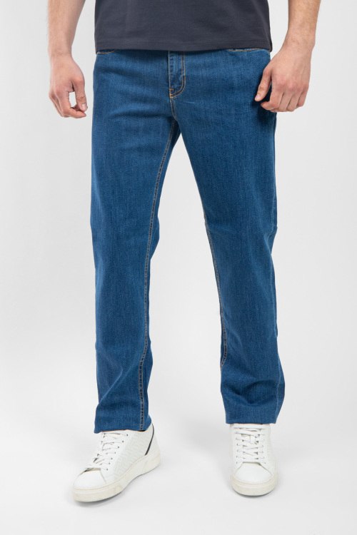 Мужские синие джинсы из хлопкового микса от Bikkembergs (Биккембергс). Прямой крой, застежка на молнию и пуговицу, пять карманов, петли в поясе для ремня, патч-лого.