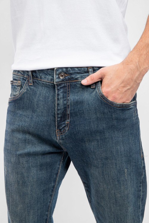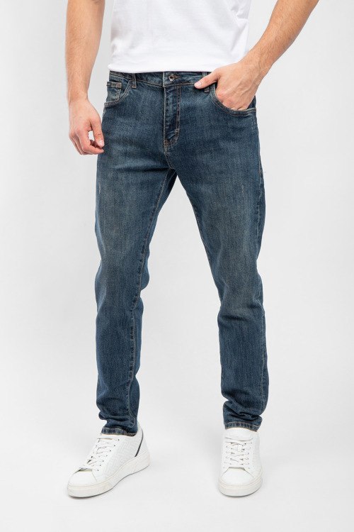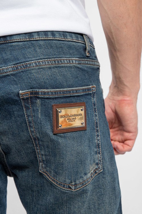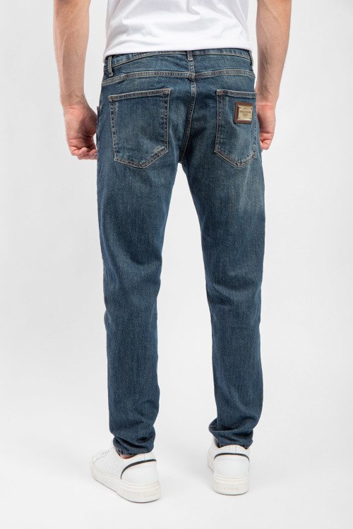 Мужские синие зауженные джинсы от Dolce & Gabbana (Дольче энд Габбана). Пяти-карманная модель, пояс с петлями для ремня, нашивка с логотипом на заднем кармане, зауженный крой, полная длина.