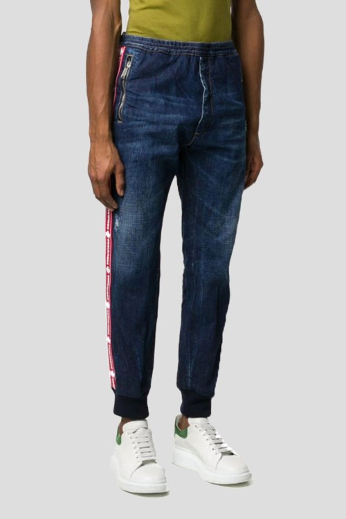 Детали: Мужские темно-синие джинсы из хлопкового микса от Dsquared2 (Дискваред). Укороченная длина, эластичная резинка на поясе, брендированные лампасы красного цвета, боковые карманы на молнии, трикотажная резинка на манжетах