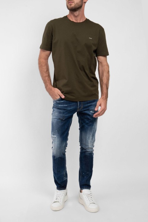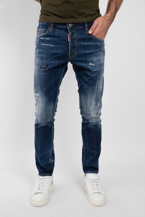 Мужские синие джинсы Skater Vintage из хлопкового микса от Dsquared2 (Дискваред). Классическая длина, застежка на пуговицы, пяти-карманная модель, петли в поясе для ремня, дизайн с потертостями, рванные детали, эффект разбрызганной краски, патч-лого.