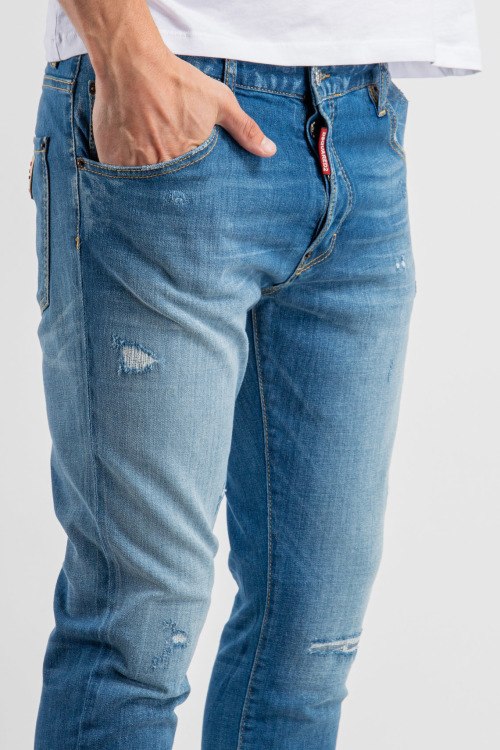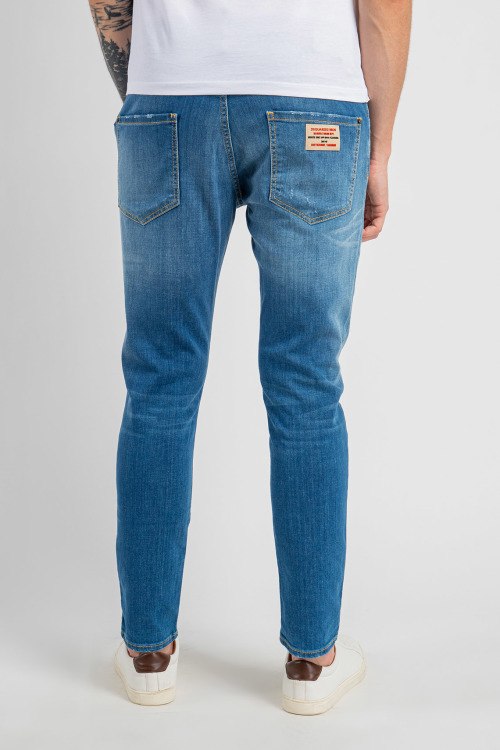 Мужские синие джинсы из хлопкового микса от Dsquared2 (Дискваред). Классическая длина, застежка на пуговицы, пять карманов, петли в поясе для ремня, рванные детали, дизайн с потертостями, патч-лого.