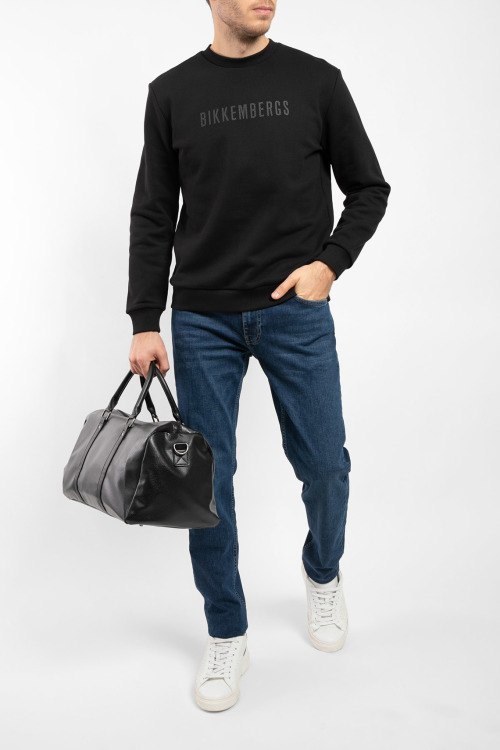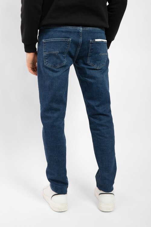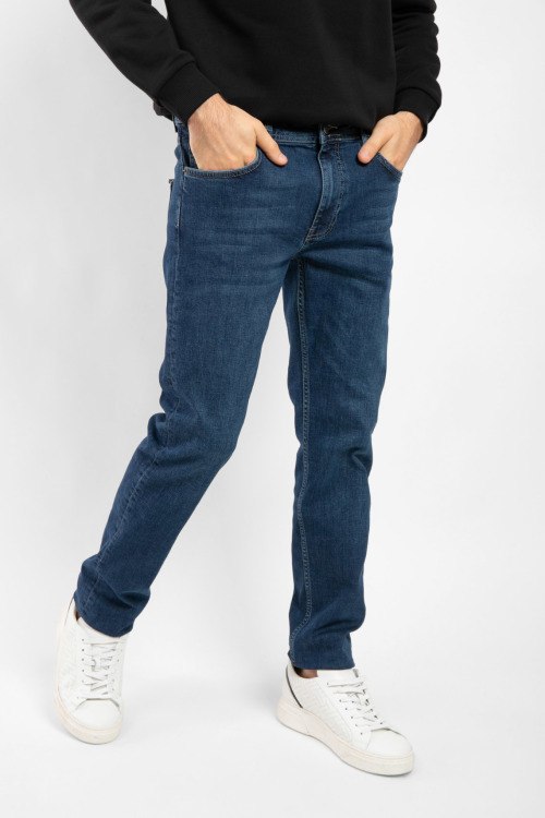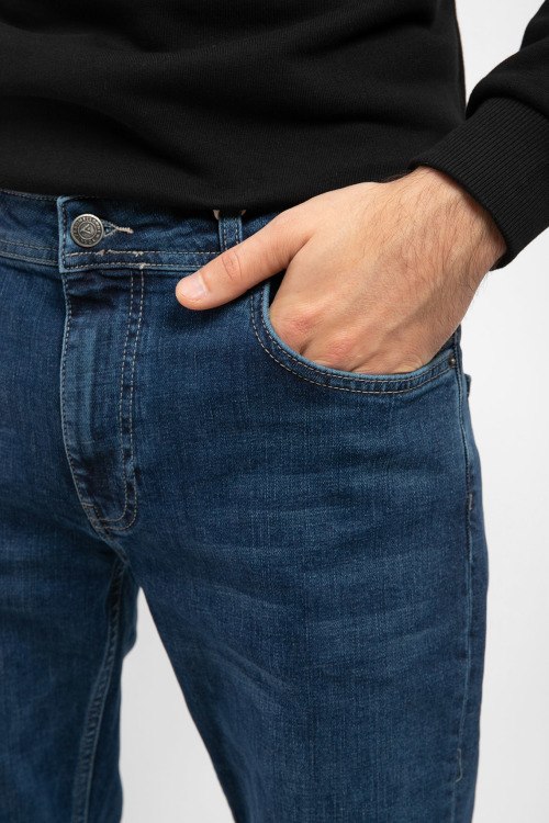 Мужские синие джинсы из хлопкового микса от Fred Mello (Фред Мелло). Классическая длина, застежка на молнию, пять карманов, петли в поясе для ремня, патч-лого.