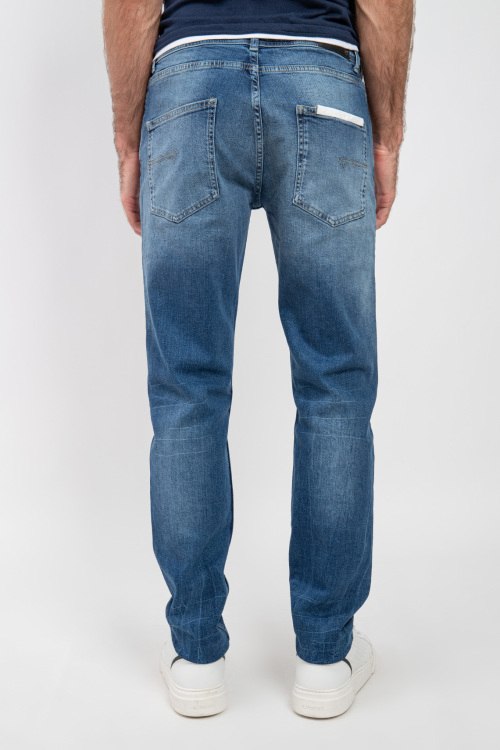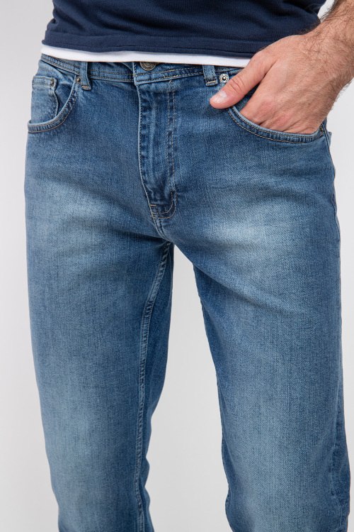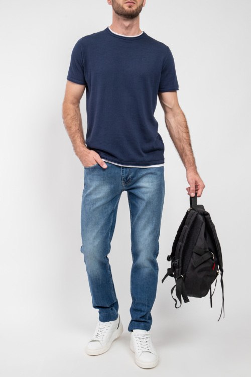 Мужские синие джинсы от Fred Mello (Фред Мелло). Пяти-карманная модель, дизайн с потертостями, пояс с петлями для ремня, нашивка с логотипом сзади на поясе, полная длина.