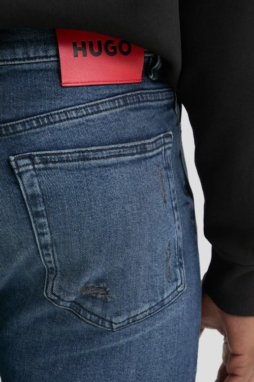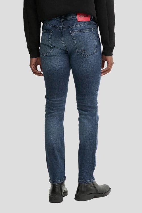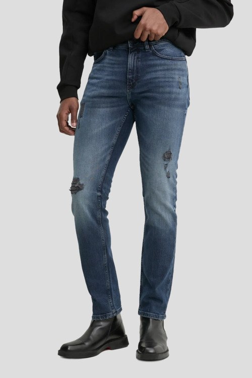 Детали: Мужские синие зауженные джинсы от Hugo Boss (Хуго Босс). Пяти-карманная модель, дизайн с потертостями, пояс с петлями для ремня, нашивка с логотипом сзади на поясе, полная длина, крой Slim Fit