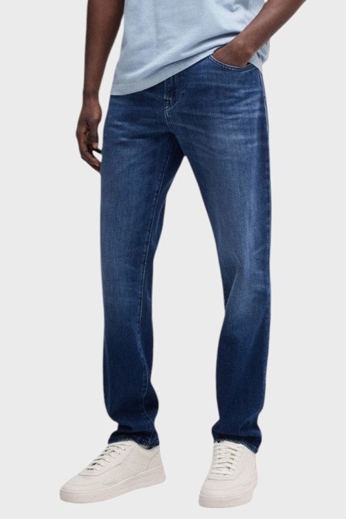 Детали: Мужские синие джинсы Re.Maine от Hugo Boss (Хуго Босс). Пяти-карманная модель, пояс с петлями для ремня, нашивка с логотипом сзади на поясе, зауженный фасон, полная длина