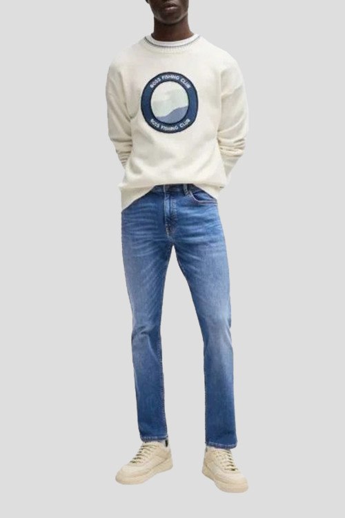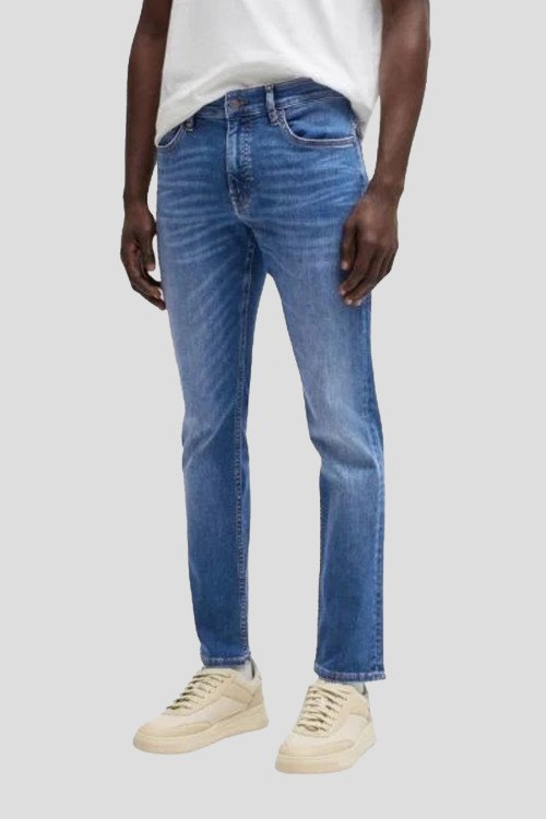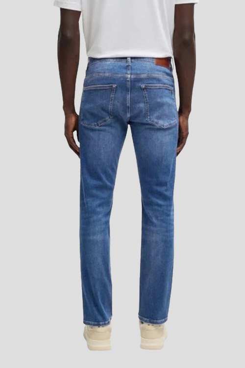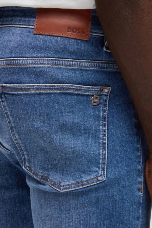 Детали: Мужские синие джинсы из хлопкового микса от Hugo Boss (Хуго Босс). Классическая длина, средняя посадка, зауженная модель, застежка на молнию и пуговицу, пять карманов, петли в поясе для ремня, патч-лого
