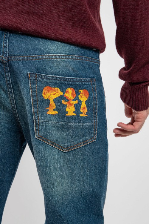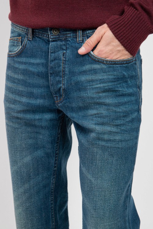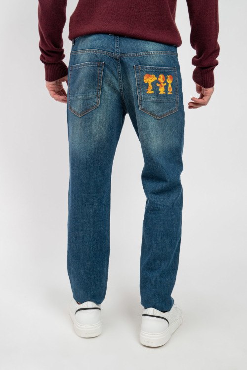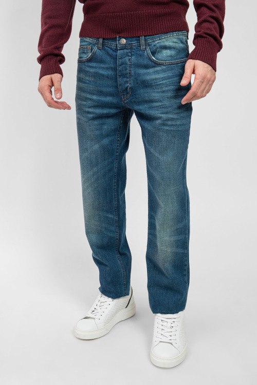 Мужские синие джинсы из хлопка от Ice (Айс). Классическая длина, застежка на пуговицы, пять карманов, петли в поясе для ремня, дизайн с потертостями, яркий принт на заднем кармане.