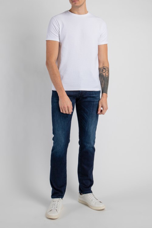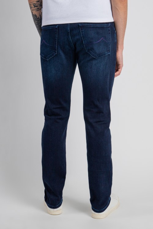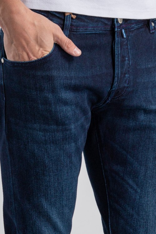 Детали: Мужские темно-синие джинсы из хлопкового микса от Jacob Cohen (Джейкоб Коэн). Классическая длина, застежка на молнию и пуговицу, пять карманов, петли в поясе для ремня, дизайн с потертостями