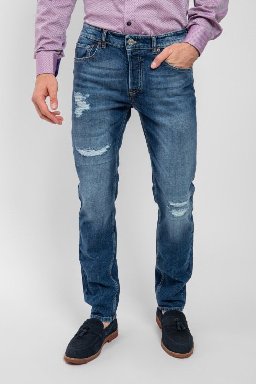 Мужские синие джинсы из хлопкового микса от PMDS (ПиЭмДиСи). Классическая длина, застежка на молнию и пуговицы, пять карманов, петли в поясе для ремня, патч-лого, дизайн с потертостями, рваные детали.