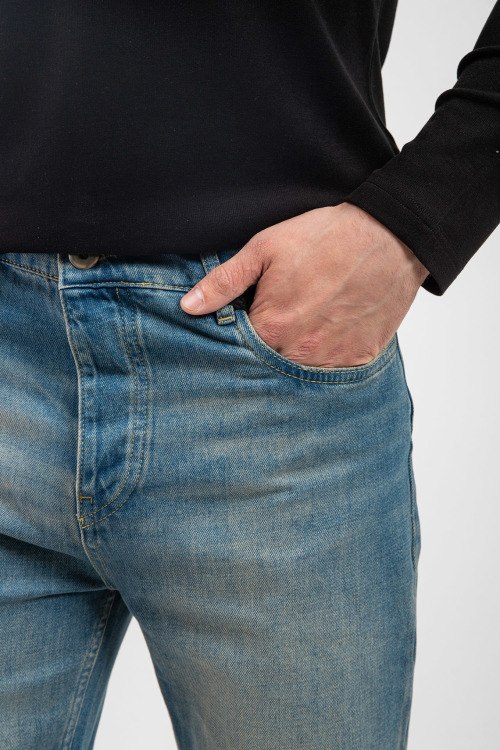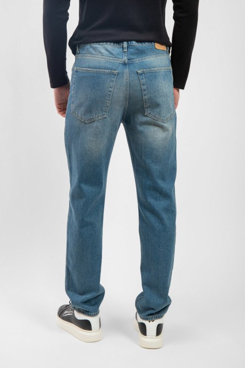 Мужские синие джинсы из хлопка от Prada (Прада). Прямой крой, застежка на молнию и пуговицу, пять карманов, петли в поясе для ремня, патч-лого, дизайн с потертостями.