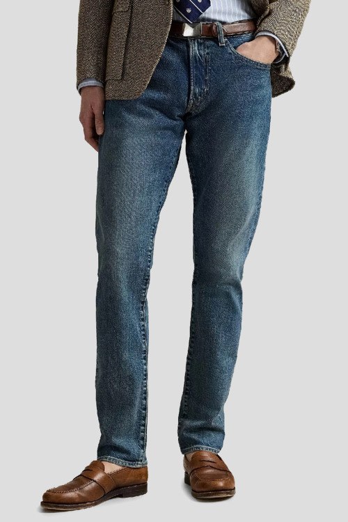 Детали: Мужские синие джинсы от Polo Ralph Lauren (Поло Ральф Лорен). Пяти-карманная модель, пояс с петлями для ремня, нашивка с логотипом сзади на поясе, зауженный фасон, полная длина