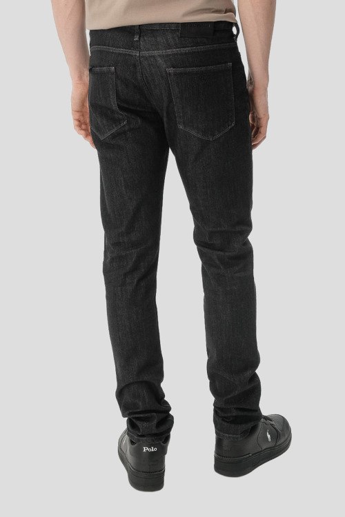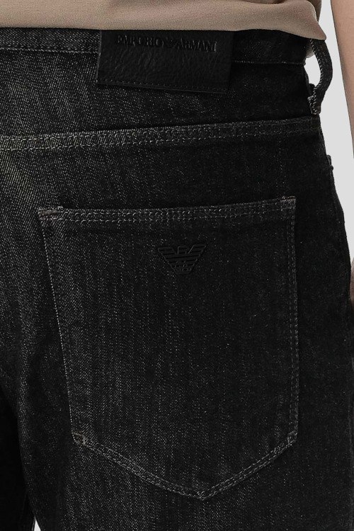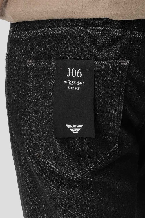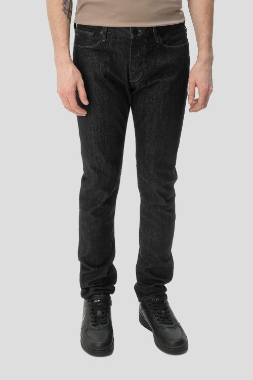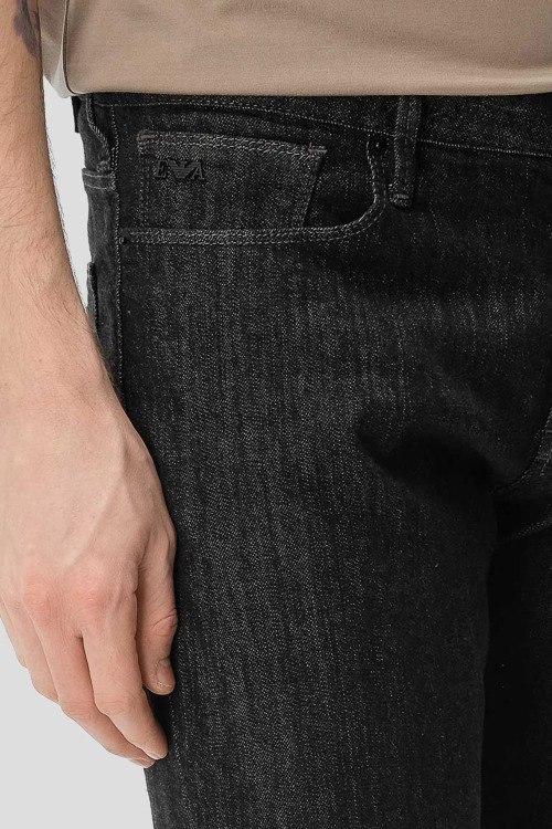 Детали: Мужские темно-серые джинсы из хлопкового микса от Emporio Armani (Эмпорио Армани). Зауженная модель, застежка на молнию и пуговицу, пять карманов, петли в поясе для ремня, патч-лого