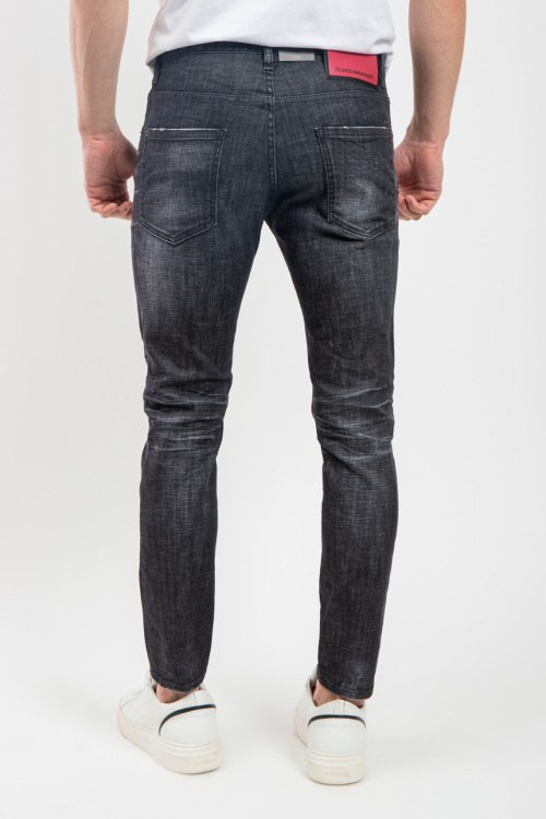 Мужские темно-серые джинсы Cool Guy из хлопкового микса от Dsquared2 (Дискваред). Классическая длина, зауженная модель, застежка на пуговицы, пяти-карманная модель, петли в поясе для ремня, патч-лого, дизайн с потертостями.