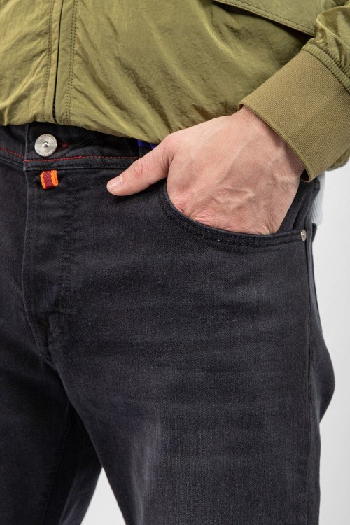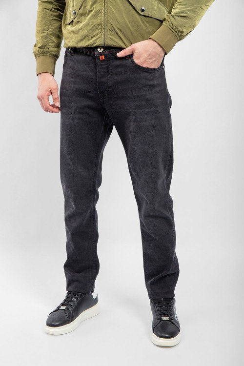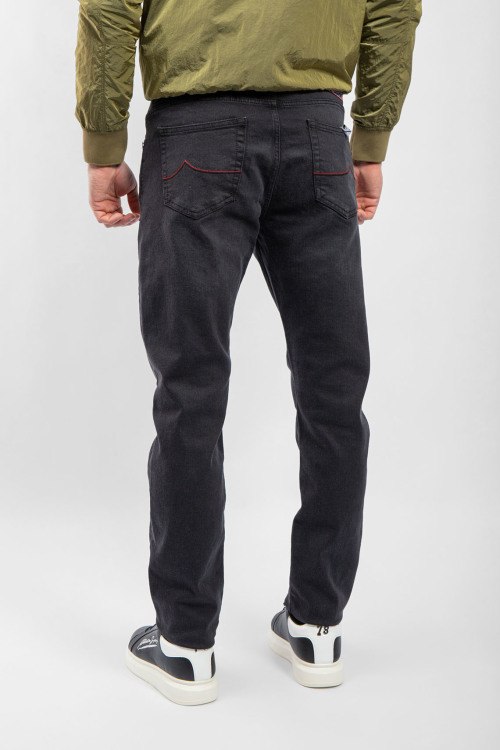Мужские темно-серые прямые джинсы от Jacob Cohen (Джейкоб Коэн). Пяти-карманная модель, пояс с петлями для ремня, нашивка с логотипом сзади на поясе, прямой крой, полная длина.