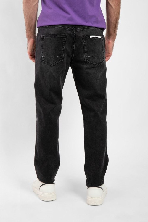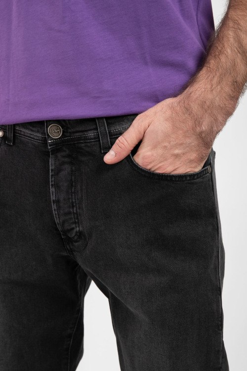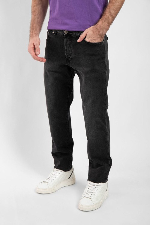 Мужские темно-серые прямые джинсы от Tombolini (Томболини). Пяти-карманная модель, пояс с петлями для ремня, нашивка с логотипом сзади на поясе, прямой крой, полная длина.