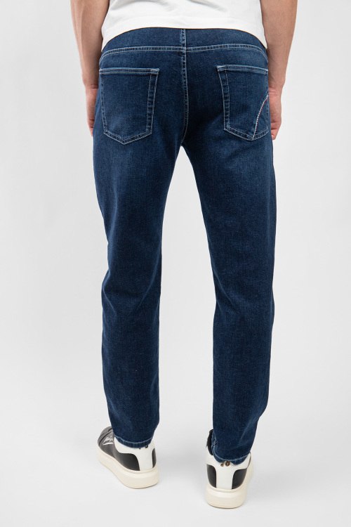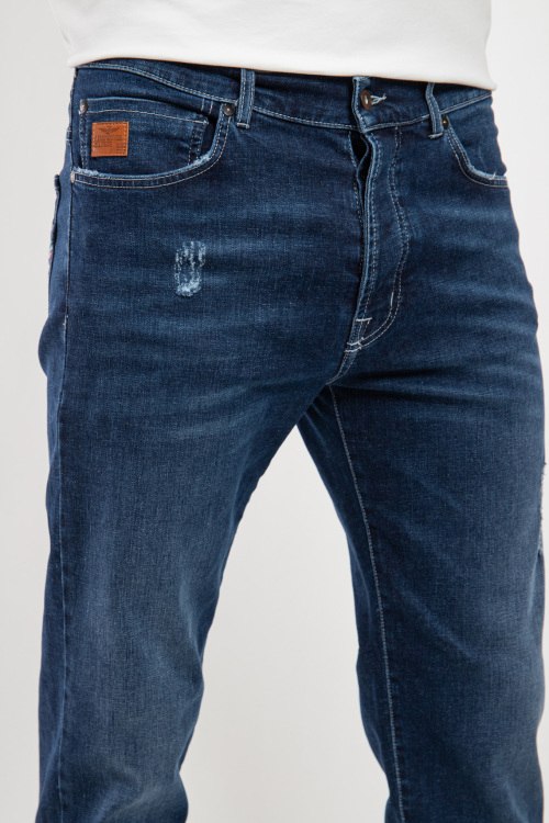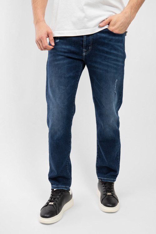 Мужские темно-синие джинсы от Aeronautica Militare (Аэронавтика Милитари). Пяти-карманная модель, дизайн с потертостями, пояс с петлями для ремня, прямой крой, полная длина.