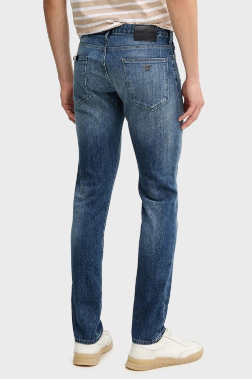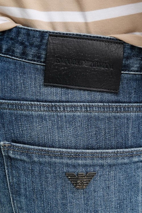 Детали: Мужские темно-синие джинсы J06 от Emporio Armani (Эмпорио Армани). Пяти-карманная модель, пояс с петлями для ремня, нашивка с логотипом сзади на поясе, зауженный крой, полная длина