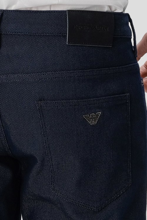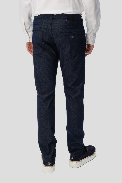 Детали: Мужские темно-синие зауженные джинсы от Emporio Armani (Эмпорио Армани). Пяти-карманная модель, пояс с петлями для ремня, нашивка с логотипом сзади на поясе, зауженный крой, полная длина