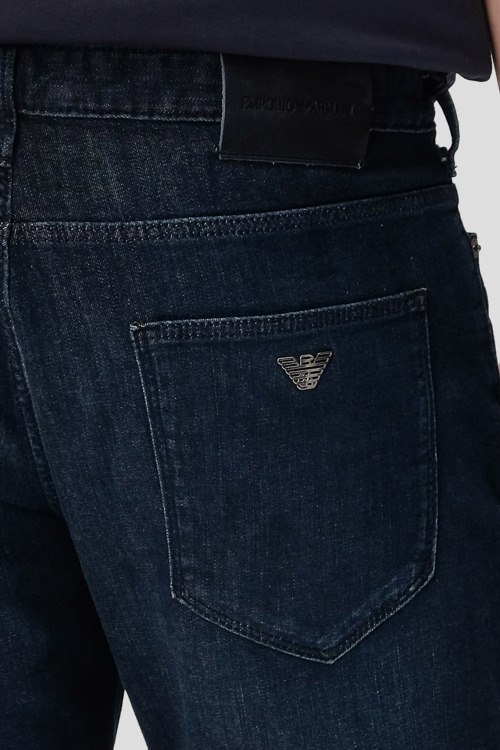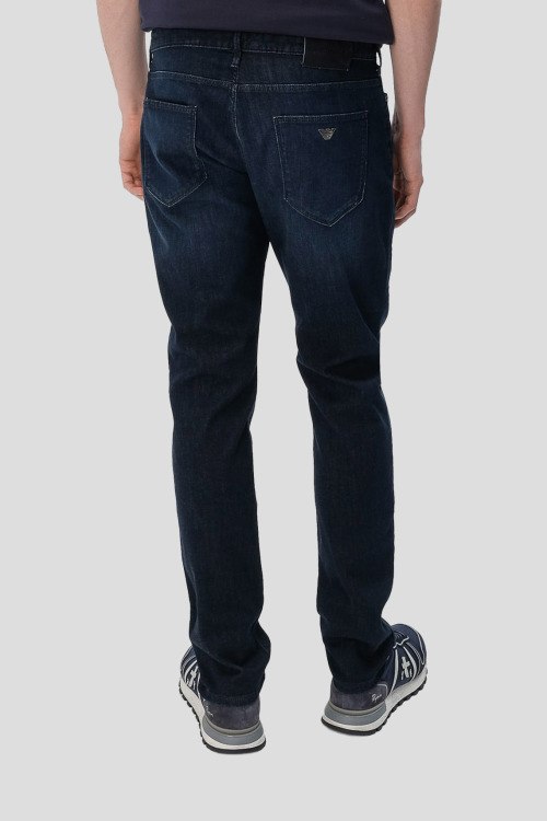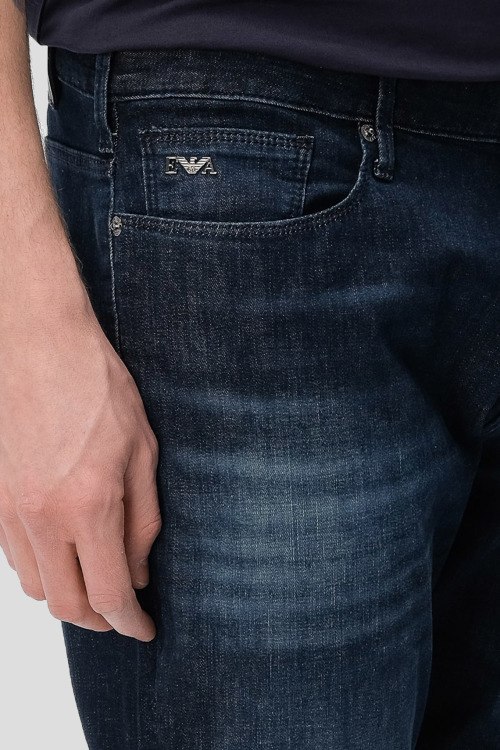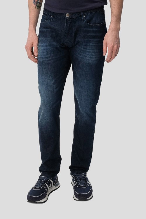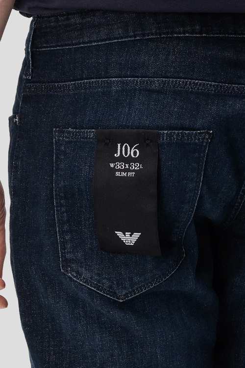 Детали: Мужские темно-синие джинсы J06 от Emporio Armani (Эмпорио Армани). Пяти-карманная модель, пояс с петлями для ремня, нашивка с логотипом сзади на поясе, полная длина