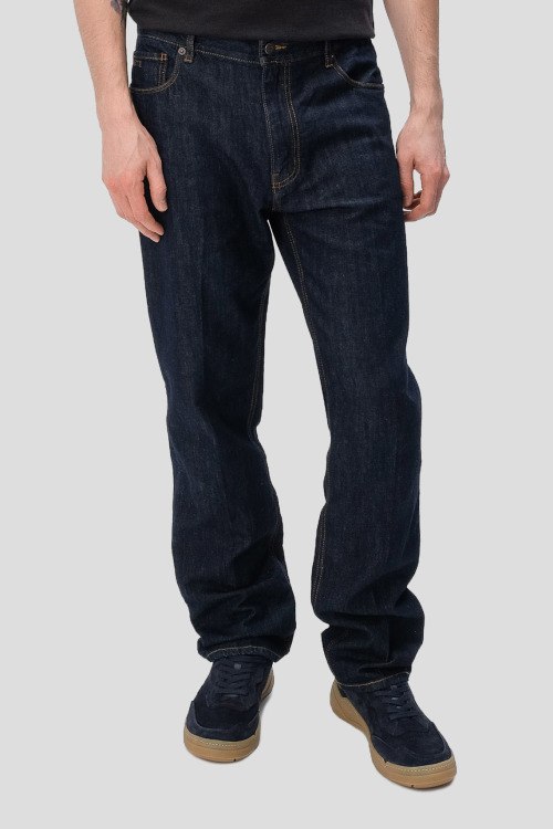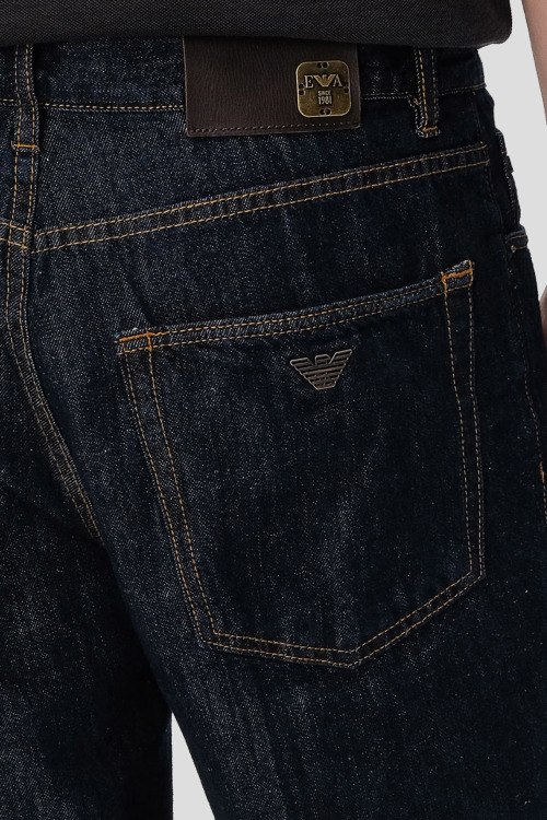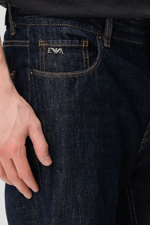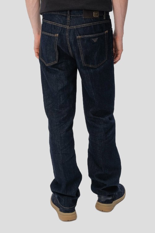 Детали: Мужские темно-синие джинсы J76 из хлопка и льна от Emporio Armani (Эмпорио Армани). Классическая длина, застежка на молнию и пуговицу, пять карманов, петли в поясе для ремня, патч-лого
