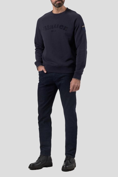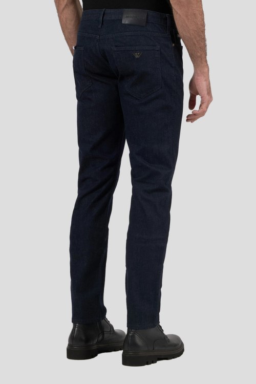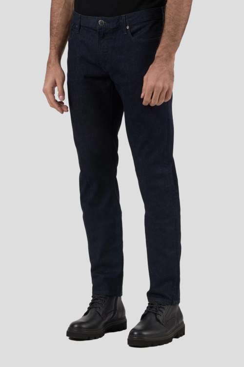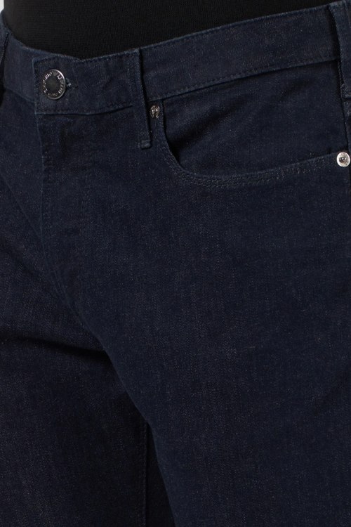 Детали: Мужские темно-синие зауженные джинсы от Armani (Армани). Пяти-карманная модель, пояс с петлями для ремня, нашивка с логотипом сзади на поясе, зауженный крой, полная длина