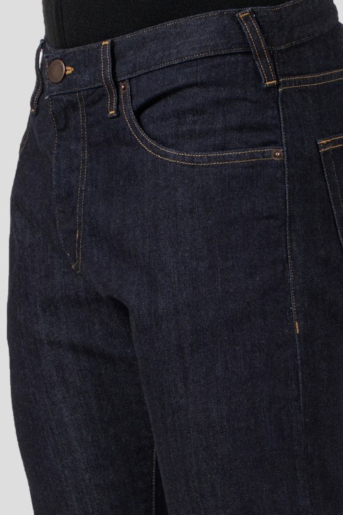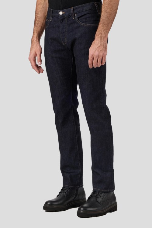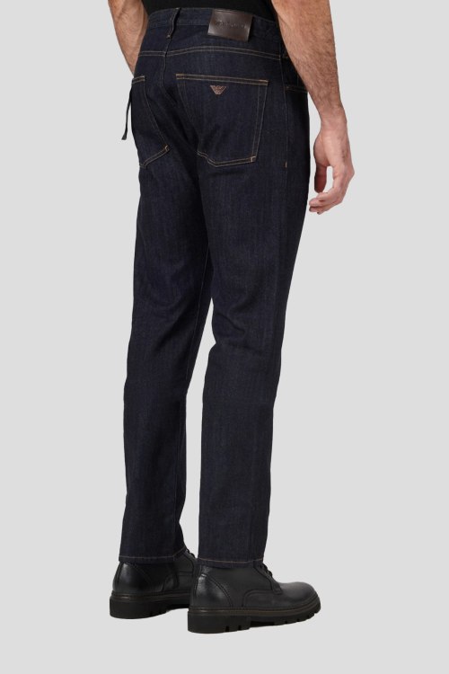 Детали: Мужские темно-синие зауженные джинсы от Armani (Армани). Пяти-карманная модель, пояс с петлями для ремня, нашивка с логотипом сзади на поясе, зауженный крой, полная длина