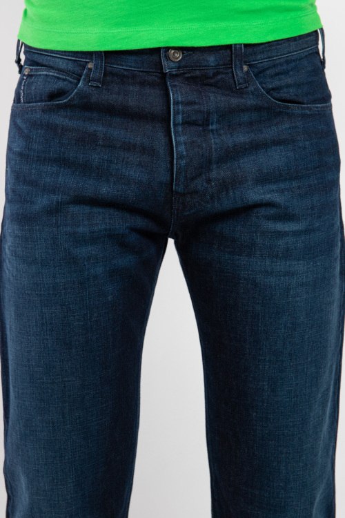 Мужские темно-синие прямые джинсы от Emporio Armani (Эмпорио Армани). Пяти-карманная модель, пояс с петлями для ремня, нашивка с логотипом на заднем кармане, прямой крой, полная длина.