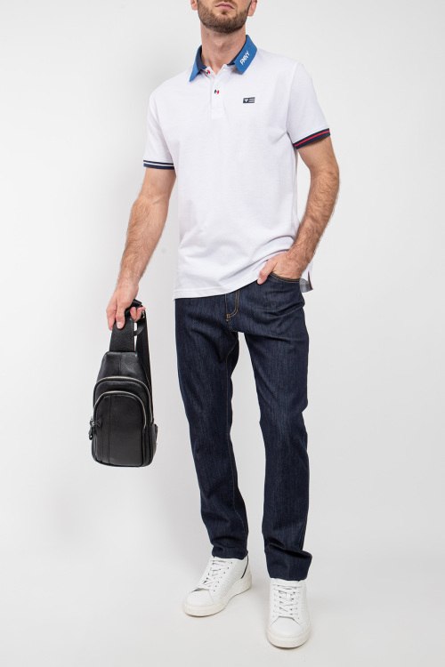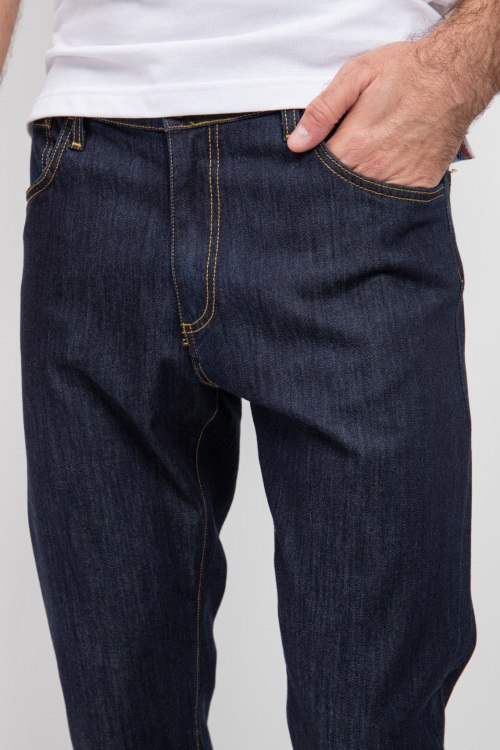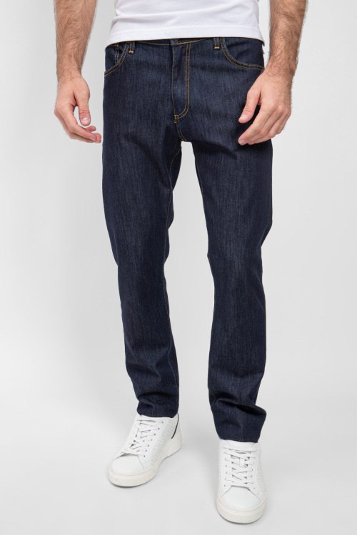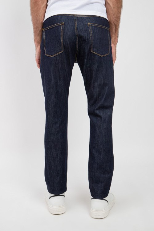 Мужские темно-синие джинсы от Bernese (Бэрнизе Милано). Пяти-карманная модель, пояс с петлями для ремня, нашивка с логотипом сзади на поясе, полная длина.