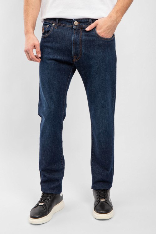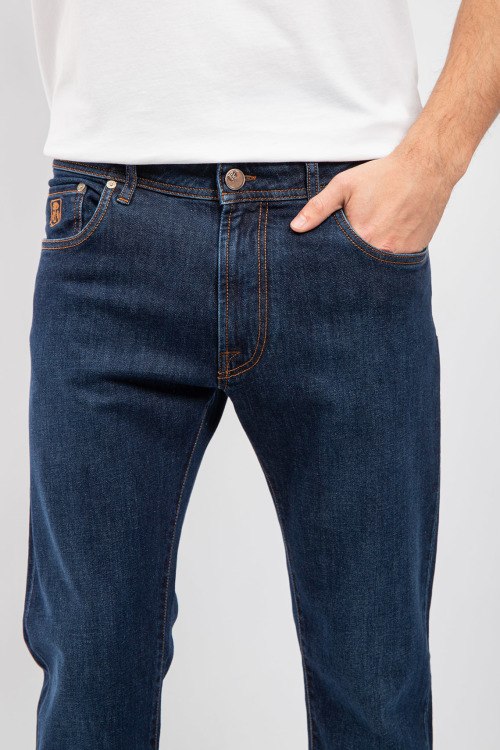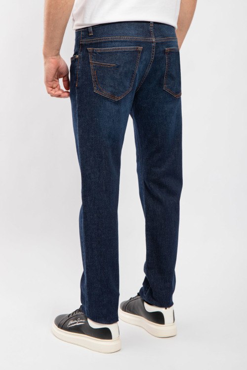 Детали: Мужские темно-синие прямые джинсы от Corneliani (Корнелиани). Пяти-карманная модель, дизайн с потертостями, в поясе с петлями для ремня, прямой крой, полная длина. Размер вещи на фото: 34