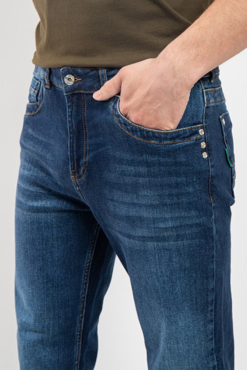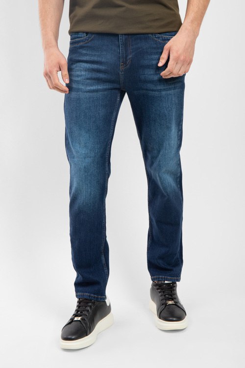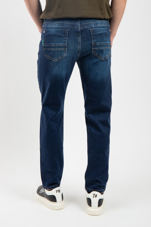 Мужские темно-синие джинсы из хлопкового микса от Bikkembergs (Биккембергс). Полная длина, средняя посадка, застежка на молнию и пуговицу, пять карманов, петли в поясе для ремня.