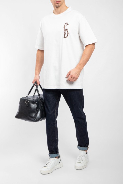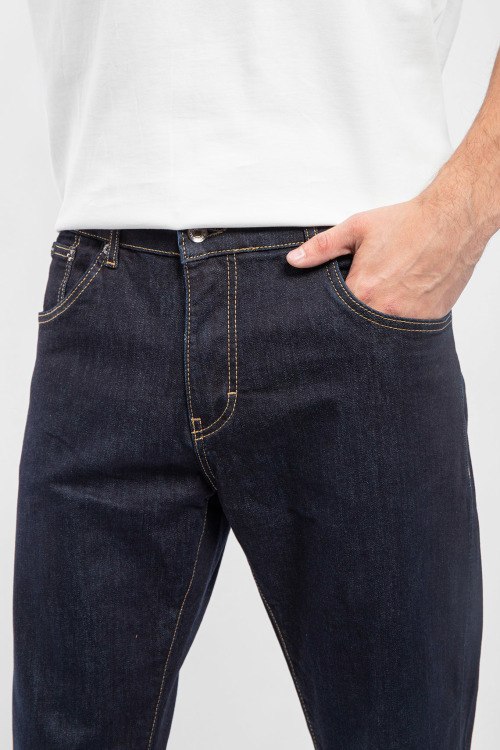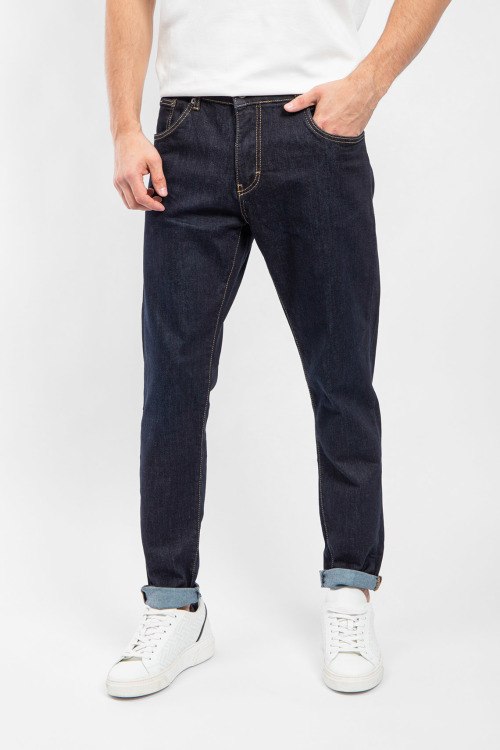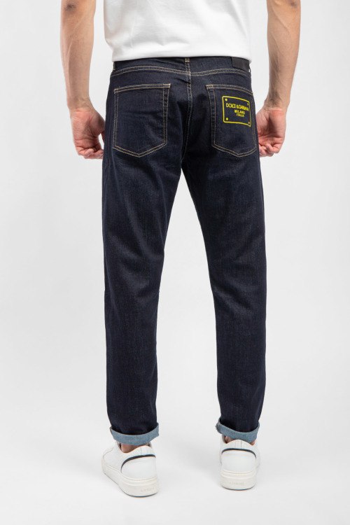 Мужские темно-синие зауженные джинсы от Dolce & Gabbana (Дольче энд Габбана). Пяти-карманная модель, пояс с петлями для ремня, нашивка с логотипом сзади на поясе, принт с логотипом на заднем кармане, зауженный крой, полная длина.