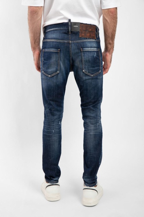 Мужские темно-синие зауженные джинсы Skater от Dsquared2 (Дискваред). Пяти-карманная модель, дизайн с потертостями, пояс с петлями для ремня, нашивка с логотипом сзади на поясе, зауженный крой, полная длина.