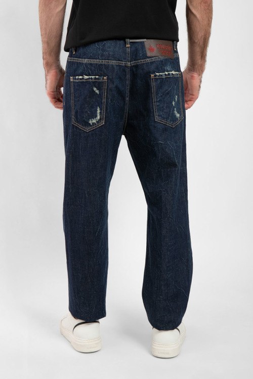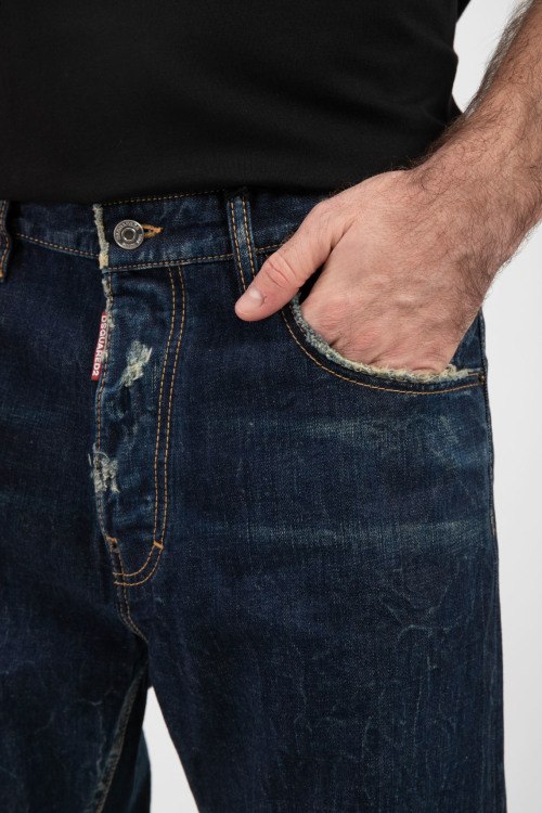 Мужские темно-синие прямые джинсы от Dsquared2 (Дискваред). Пяти-карманная модель, пояс с петлями для ремня, нашивка с логотипом сзади на поясе, прямой крой, полная длина.