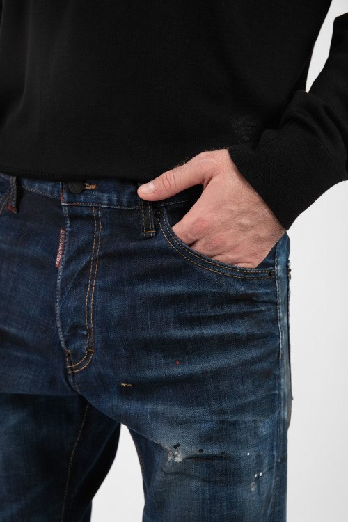 Мужские темно-синие прямые джинсы Cool Guy от Dsquared2 (Дискваред). Пяти-карманная модель, дизайн с потертостями, пояс с петлями для ремня, нашивка с логотипом сзади на поясе, прямой крой, полная длина.