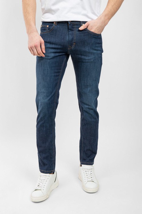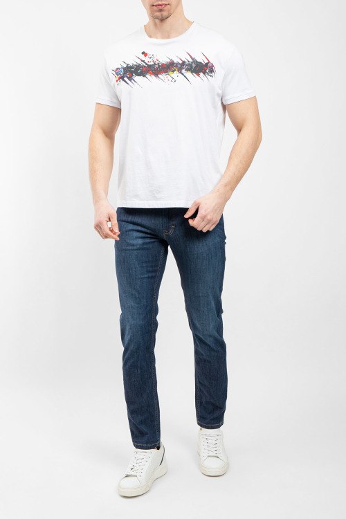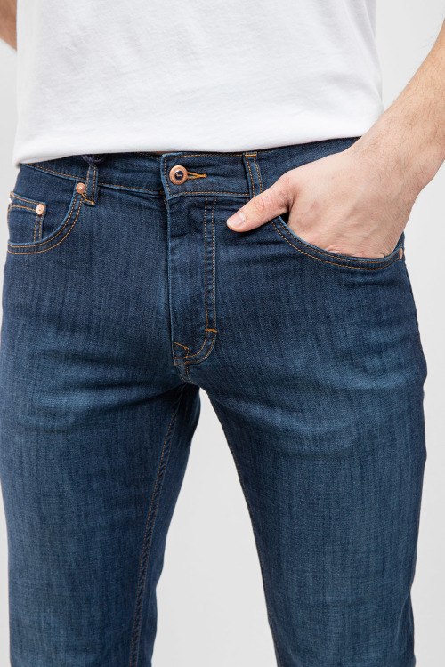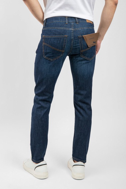 Мужские темно-синие джинсы из хлопкового микса от Harmont & Blaine (Хармонт энд Блейн). Классическая длина, застежка на молнию и пуговицу, пять карманов, петли в поясе для ремня, патч-лого.