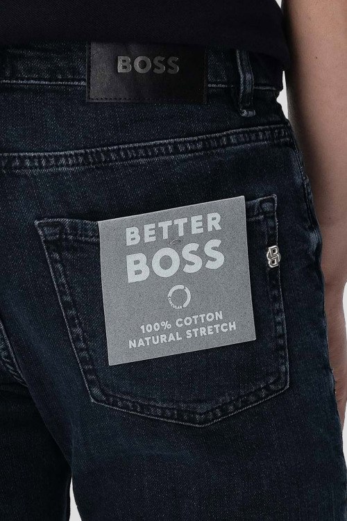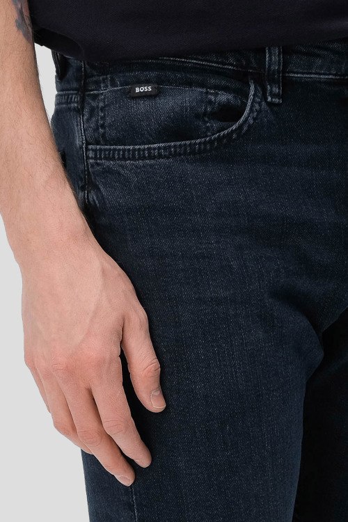 Детали: Мужские темно-синие джинсы H-Delaware от Hugo Boss (Хуго Босс). Пяти-карманная модель, пояс с петлями для ремня, нашивка с логотипом сзади на поясе, крой Slim Fit, полная длина